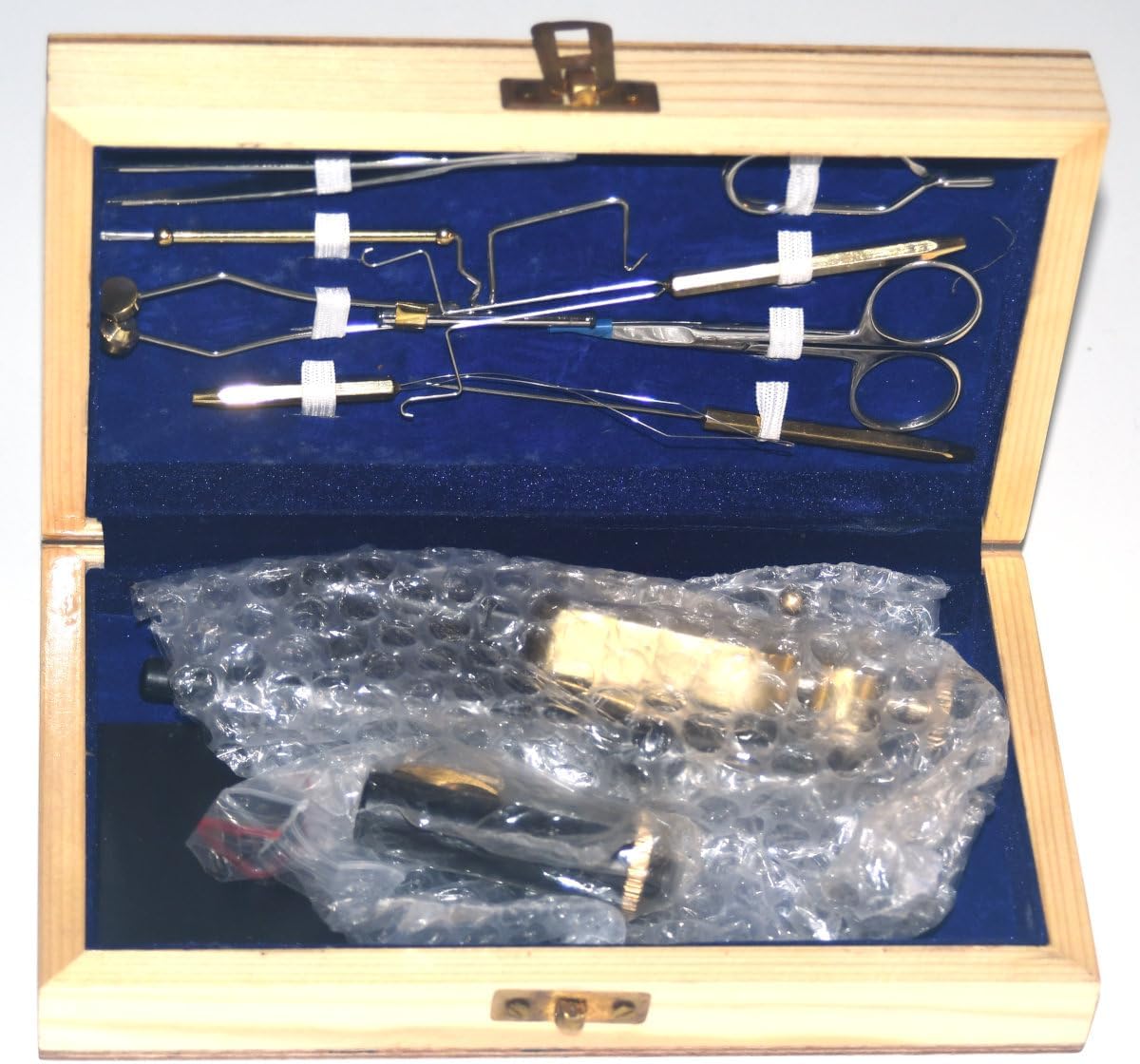 The AMPRO may be the perfect portable vise set. It includes a crown vise, dubbing twister, bodkin, scissors, rotary whip finisher, standard ceramic bobbin, bobbin threader, hackle pliers and tweezers plus a pedestal base; all of this is in a wooden case. The tools are premium tools designed to get you started in fly tying. We included teh most popular styles of each tool including the Matarelli style whip finisher, straight-point scissors, a dubbing needle with half-hitch tool, tweezers, bobbin threader, and dubbing twister. All of these are durable, well made tools and will last a lifetime. The crown vise requires no tedious adjustment to set the hook. Squeeze the lever to spread the spring-loaded jaws apart, place the hook, and you're ready to tie. Hooks from size 20 to at least 6/0 (and larger, depending on hook design) fit in this well-designed set of vise jaws. Also included is a QR code that links to an instructional video to help you set up the vise, use the tools, and tie basic flies that will develop your tying skills including: a Zebra Midge, a woolly bugger, and a scud. The best thing about it is that if you decide to move to another vise later on, you'll be glad to have this set. (Product style and colors may vary slightly from photographs.)