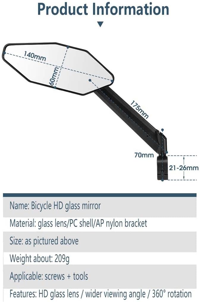 Product Details:Name: Bicycle HD glass mirrorMaterial: glass lens/PC shell/AP nylon bracketSize: as pictured aboveWeight about: 209gApplicable: screws + toolsFeatures: HD glass lens / wider viewing angle / 360° rotationInclude: rearview mirror*2