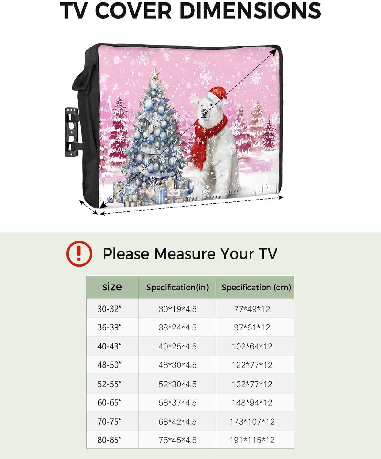 Waterproof TV Cover, Protect Your TV Our 600D Oxford cloth TV cover is strong and sturdy, weatherproof, waterproof, dirt and dustproof, easy to install and easy to clean. Feature - Well Made Outdoor TC Covers: Compared with other TV covers made of non-600D material, our TV protectors are more durability, protecting your TV from external damage and extending the service life of your TV. - Weatherproof: The premium weatherproof outdoor TV cover for your TV will keep your device intact and suitable for use in all seasons. - Waterproof: Our weatherproof TV box is waterresistant and highly waterproof, providing the best possible protection for your outdoor TV. - Scratchproof: The soft and smooth TV screen protector interior is PVC coated to prevent the TV screen from scratches, providing solid protection for your outside TV. - Full Cover Protection: Our TV covers with bottom cover give your TV a perfect all-round protection. - Easy to Clean:Machine washable and hand washable, iron at low temperature if necessary, do not bleach. Specification Suitable for Your TV Size: 30"-32"/ 40"-43"/ 48"-50"/ 52"-55"/ 60"-65"/ 70"-75" Package: 1x Flat Screen TV Cover Protector