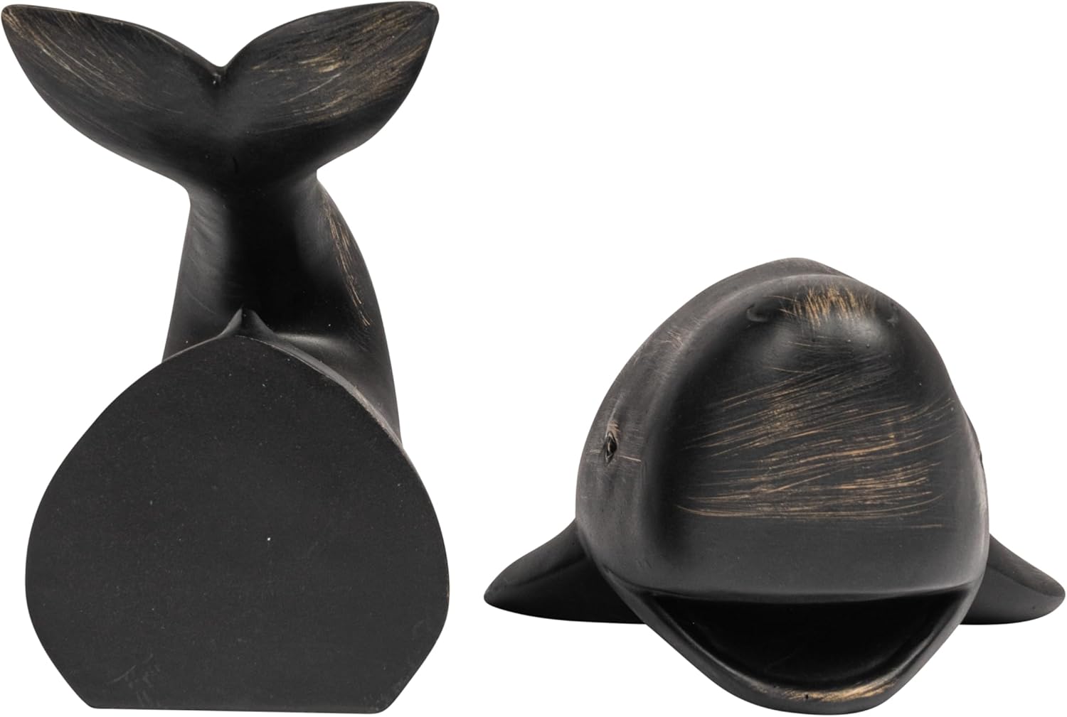 These distressed black resin whale bookends are a fun and unique way to organize and decorate the book collection. They are made of polyresin, which is a sturdy and lightweight material that can hold up books of various sizes and weights. They have a split whale design, where the whale's head and tail are separated by the books placed in between them. They have a distressed black finish that gives them a vintage and weathered look, adding some nautical charm and whimsy to the home décor. They are ideal for any coastal, rustic, or farmhouse style of home décor, as they complement any color scheme and material. They are great for displaying books in the living room, office, or bedroom. The bookend measures 11 inches long, 6.5 inches wide, and 6.75 inches high. To maintain their beauty, simply wipe them with a dry cloth. These bookends are a versatile and stylish addition to any home.