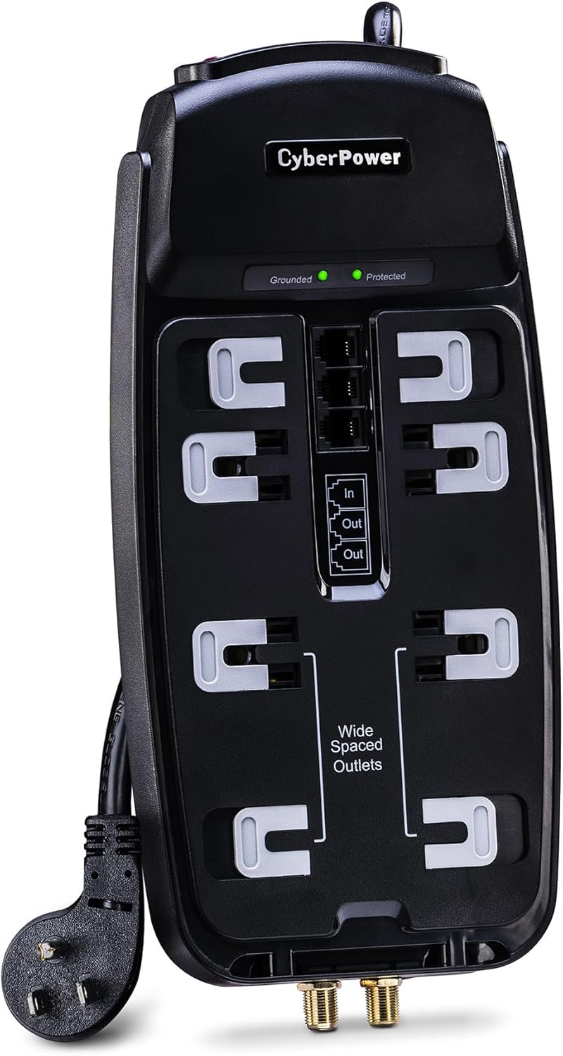 The Home Theater Surge Protector CSHT808TC provides 2850 joules of surge protection and 8 outlets to safeguard your home theater equipment from damage caused by electrical surges. Data line protection occurs with RJ11 ports for telecommunication devices such as phones, faxes, modems, and DSL lines. Gold-plated RG6 coaxial connectors protect cable/satellite TV receivers and broadband modems. Features of the CSHT808TC include automatic shutdown, 8 surge-protected outlets (4 widely spaced for transformer plugs), a power cord (8 ft.), a right-angle plug with 45° off-set, LED status indicators, keyhole mounting slots, impact-resistant casing, metal oxide varistor (MOV) technology, and an EMI/RFI noise filter. This surge suppressor comes with a Limited Lifetime Warranty and a Connected Equipment Guarantee.