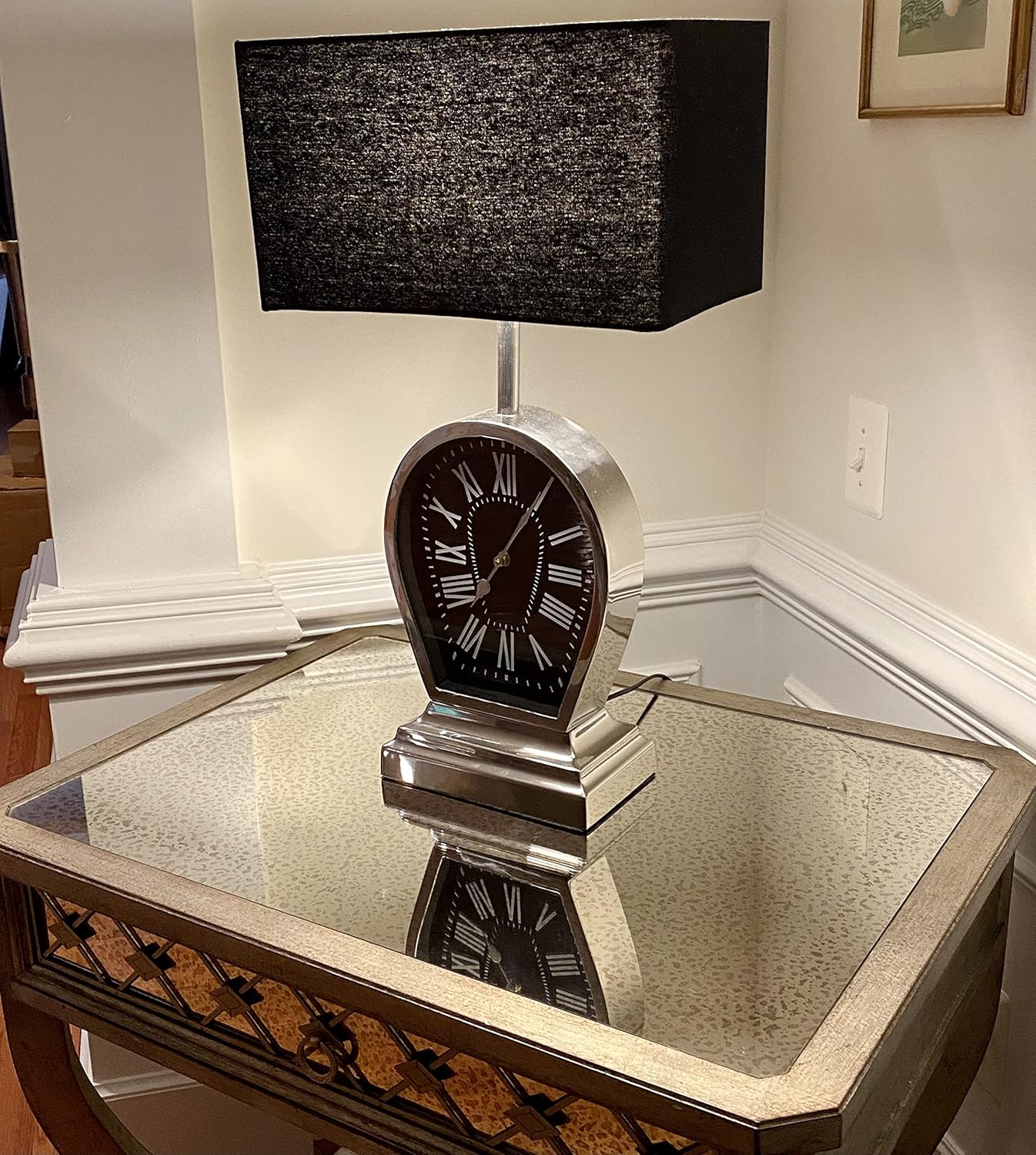 Classic Decorative stainless steel and aluminum table lamp with an analog clock a beautiful addition for your drawing room table and bedside table. This vintage table lamp with a clock is constructed using aluminum, stainless steel with black fabric and will make a great combo with a variety of decor styles. This table lamp you can use as a Bedside Lamp Clock, Study Desk, Office desk lamp and modern decorative lamp in the living room.