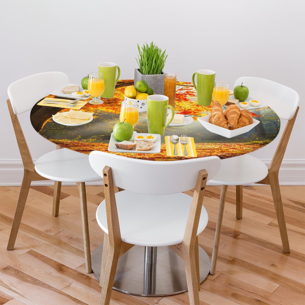 fall tree leaves round tablecloth with elastic edge small fitted circle table cover wipeable round table cloth for indoor outdoor patio Dining Kitchen decorOur store offers a variety of DIY-themed table covers round designs for you to choose from, including animal, floral, beach, marble, funny, and cute styles.Product Size: Fits 36-42inch or 45-56inch round tables made of wood, glass, or metal.Product Included: 1 fitted round table cloth.Product Features:The elastic edge ensures a secure fit, preventing the fall tree leaves tablecloths from slipping or sliding.Child-friendly design prevents kids from easily pulling it off.Our circle table cover is made of durable polyester fabric that is fade-resistant and tear-resistant wipeable, waterproof, and oil-proof. Liquids such as drinks, soup, or sauces won't penetrate the surface—just clean with a damp cloth.Machine washable on a delicate cycle with mild detergent. Do not bleach. Iron on low heat from the back if needed.this circle table protector is suitable for dining tables, kitchens, restaurants, buffet dinners, picnics, banquets, coffee tables, weddings, parties, birthdays, cafes, barbecues, camping,patio and both indoor and outdoor use.Gift Idea:This fall tree leaves fitted tablecloth makes a thoughtful gift for moms, dads, sisters, brothers, grandparents, spouses, children, friends, and all other loved ones. Choose from a variety of fun, stylish, and surprising designs to suit any personality.