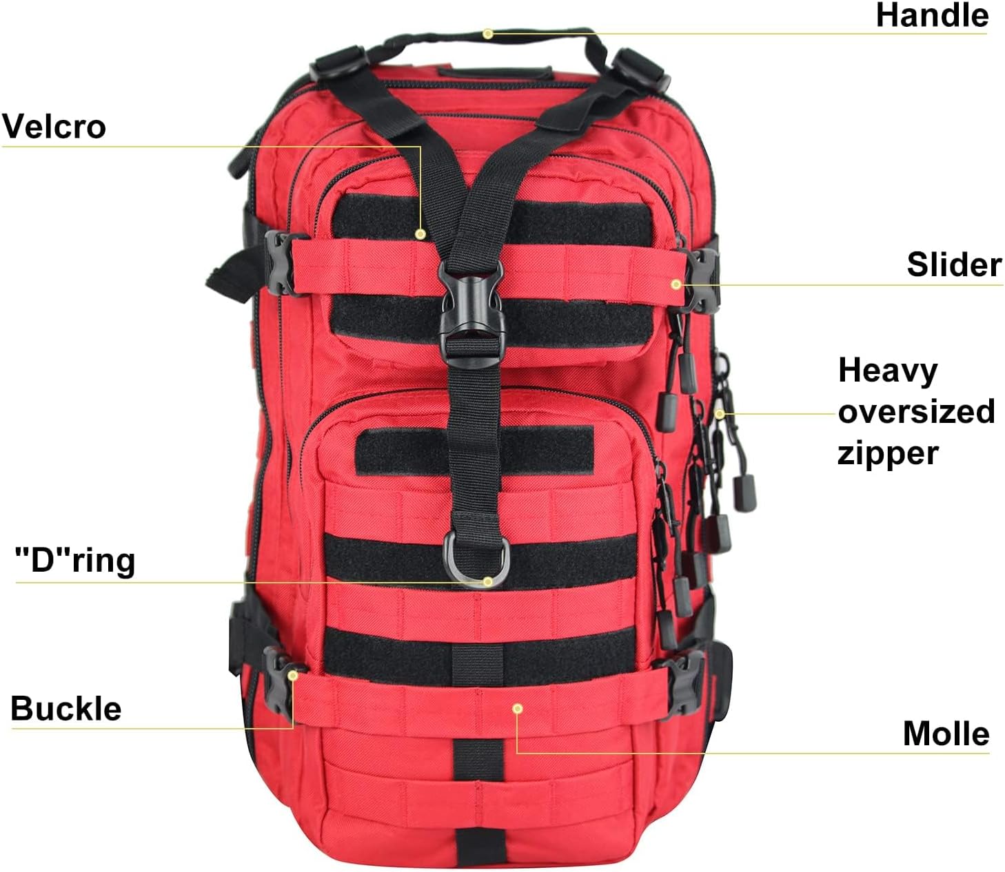 Features1. Multiple Compartments2. Multiple Exterior Pockets3. Multiple Mesh Interior Pockets4. Adjustable padded Straps5. 6”wide x .75”tall spot for Velcro patches on the Top,Rear Pouch6. Reverse zippers to keep out dust and dirt7. 5”wide x 1” tall spot for embroidery on the Lower,Rear pouch8. 600 denier polyester lined with PVC,water resistant9. 600 denier polyester lined out dust and dirt10.Multiple Buckles for Security11.Mesh Padded Back (for easy air flow and comfort) between the pack and the back of the user12.Water resistant13.PALS Webbing On Front&Side14.Multiple D Rings on the back ,top and shoulder strapsDescription Of Each PartUp Front Compartment:survival package, first aid kit,magazine clip, bullet box, mobile phone.Down Front Compartment:pistol, walkie-talkie, shotgun bullets, knives.Medium Compartment:map, compass, medical kit, kit, telescope, gun with (laser), camouflage cosmetic case.Main Compartment:clothing, tent, gun pad, gun rope.Back Compartment:water bag.