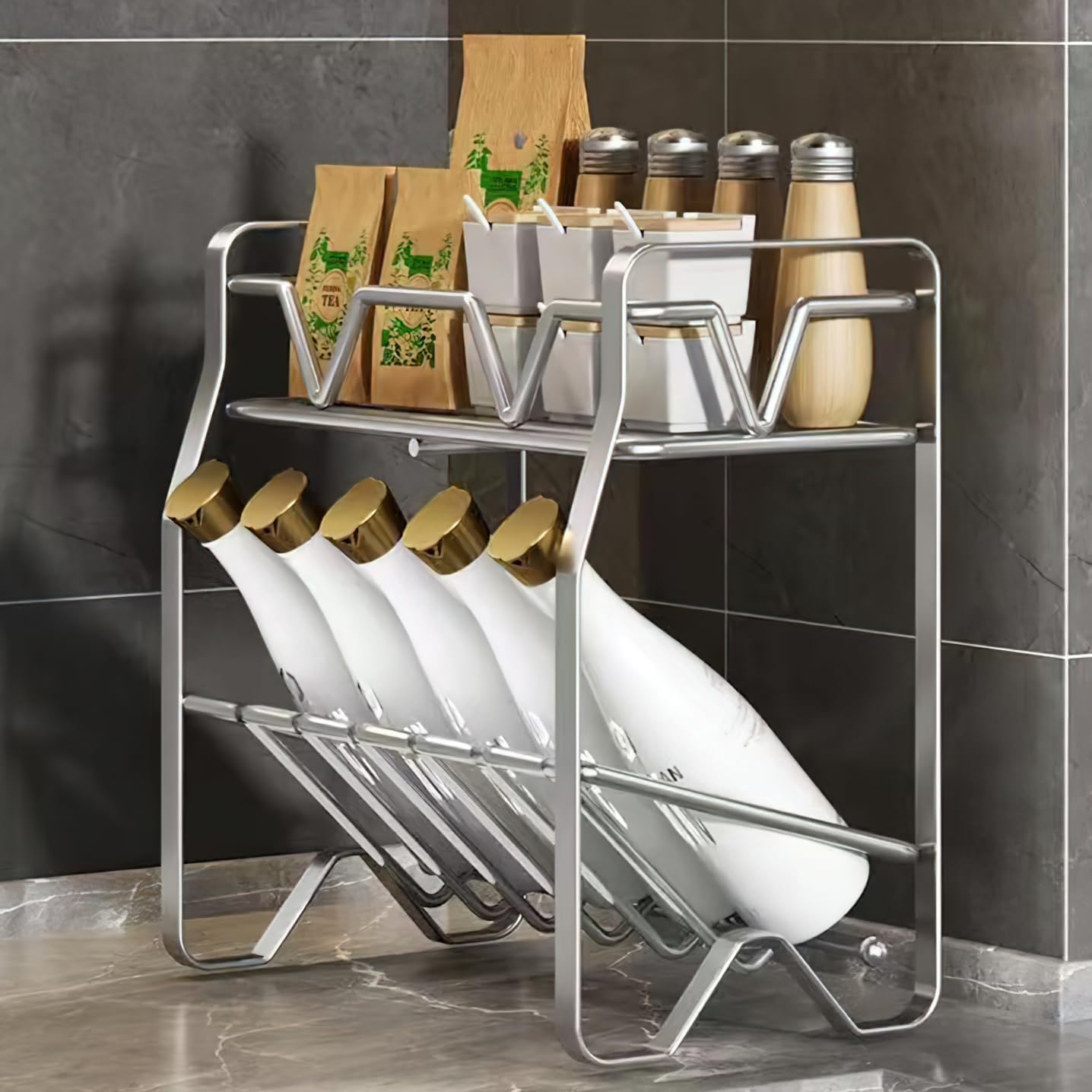 Transform your kitchen organization with this sleek stainless steel seasoning rack designed for corner placement. This multi-layer storage solution maximizes your counter space while keeping cooking essentials within easy reach. Perfect for storing oils, vinegars, salt, sauces, and other frequently used seasonings, this rack helps create an efficient cooking station. The tiered design allows for excellent visibility and access to all your items, while the sturdy stainless steel construction ensures durability and stability. Ideal for home cooks who want to keep their countertops neat and organized while maintaining quick access to cooking necessities. The practical corner design makes efficient use of often underutilized kitchen space, helping you maintain a clutter-free cooking environment. Whether you're a seasoned chef or just starting your culinary journey, this storage rack streamlines your kitchen workflow and adds a touch of professional organization to your space.