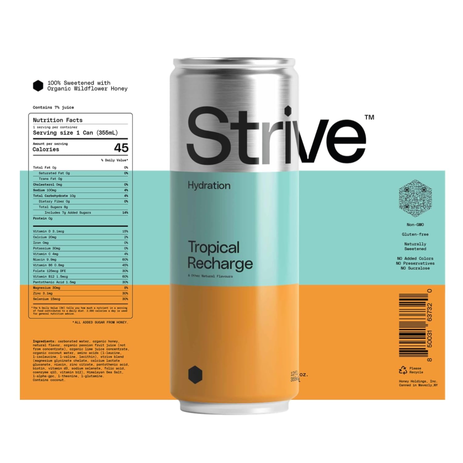 Strive Soda Tropical Recharge - Sparkling Hydration Soda with Electrolytes & Organic Honey - Passionfruit Coconut Naturally Sweetened Drink - No Artificial Sweeteners or Preservatives - 12 Pack Cans