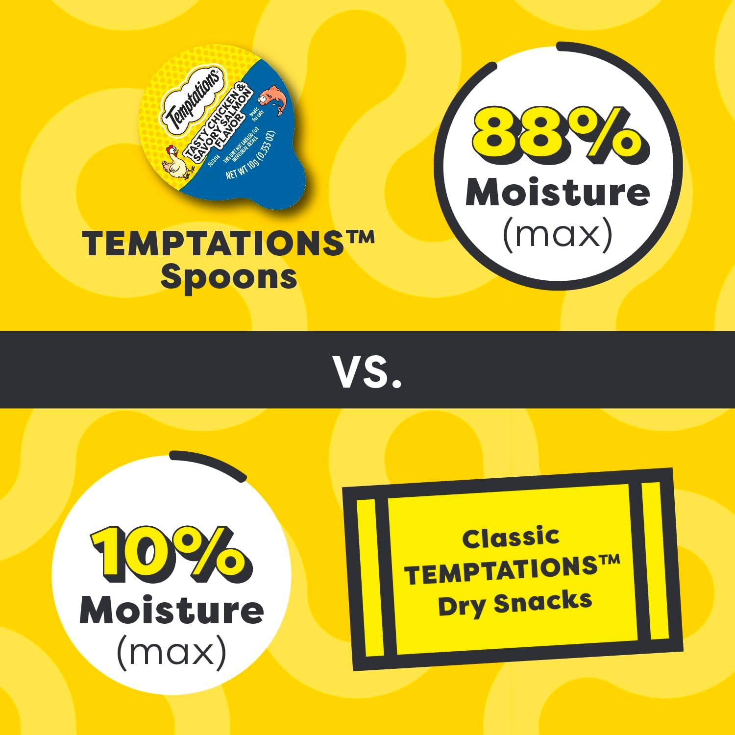 Your feline’s favorite cat treat brand can be enjoyed in a Lickable Spoon format! Stir up some delicious moments with your furry best friend with Temptations Lickable Spoons Tasty Chicken and Savory Salmon flavor lickable wet cat treat. The creamy treat comes in a specially designed spoon and combines two tasty flavors. The purr-fect spoon size makes it easy to eat and easy to treat your cat for a memorable bonding experience. Temptations Lickable Spoons can also be used as a meal complement to make mealtime extra special. Temptations Spoons, with added vitamins and minerals, have no fillers or artificial flavors. Enjoy treat time with your furry feline, one spoon at a time!