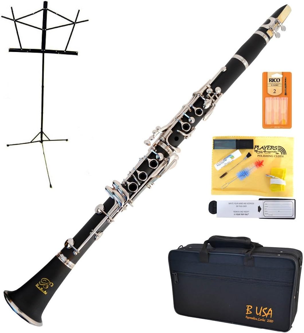 Affordable Simulated Ebonite Shiny Black Resin Body Bb Clarinet Designed for the Beginner Student complete with deluxe travel case, Ligature, Mouth Piece, Single Reed, Cleaning Cloth and Cork Grease. From Bridgecraft USA, the trusted name in the world of musical instruments. What else can you say? This instrument offers fabulous sound at an unbeatable price - it simply can't be beat!