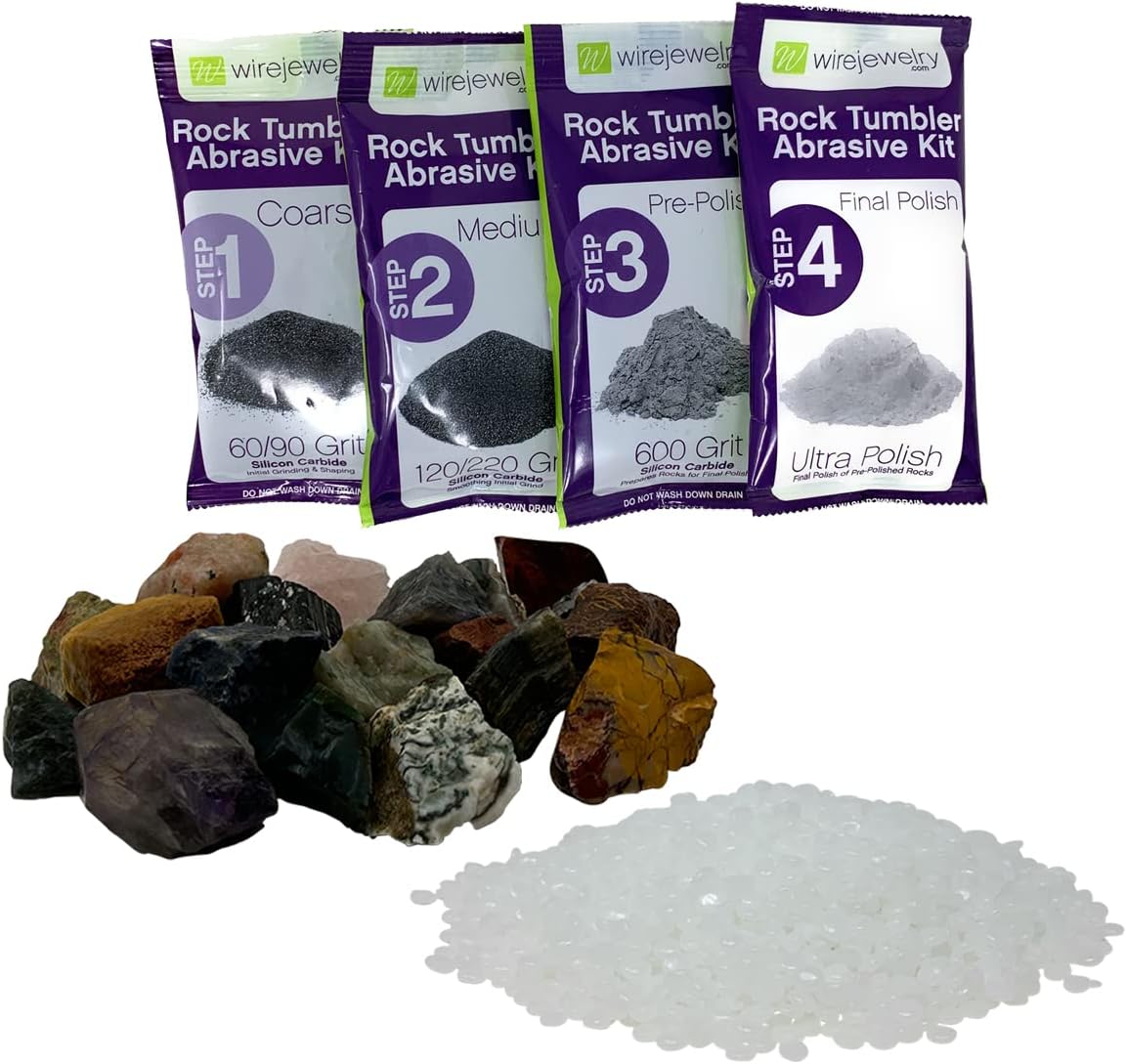 The WireJewelry World Stone Mix Rock Tumbler Refill Kit comes with 3 Lbs of eac Stone Mix Location (Asia, Brazil & Madagascar) and 6 batches of premeasured grit and polish that is conveniently packed in single use tear packs.Grit and Abrasive Kit Includes (6 Batches): Step 1 - Coarse Step 2 - Medium Step 3 - Pre-Polish Step 4 - Final Polish Stone Mix Details: Quantity: 3 lbs of Stone Mix from each Location (Asia, Brazil and Madagascar) Average Size: 1.5" to 2" with 20-30 Gram Weight Every Bag is a Unique Assortment of Rock Types & on average will include over 50 different types of stones Photos Show a Range of Color and Size of the Material. Not Actual QuantityGemestones you may find in your mix included: Agate, Amazonite, Amethyst, Apatite, Aragonite, Black Jasper, Black Onyx, Black Rutile, Black Tourmaline, Black Volcano, Bloodstone, Blue Calcite, Blue Grey Agate, Blue Quartz, Brecciated Jasper, Carnelian, Chamki Ruby, Chestnut Jasper, Chrysocolla, Citrine, Clear Quartz, Crystal Quartz, Dalmation Jasper, Desert Jasper, Fancy Jasper, Fire Quartz, Fuschite, Garnet, Girasol, Green Aventurine, Green Jasper, Green Opal, Green Volcano, Green Worm, Grey Agate, Heena Jasper, Hematite, Indigo Gabbro, Iolite, Kambaba Jasper, King White Quartz, Labradorite, Landscape Jasper, Lapis Lazuli, Leopard Jasper, Lepidolite, Moonstone, Orange Calcite, Orbicular Jasper, Panther Jasper, Peach Aventurine, Petrified Wood, Picasso Jasper, Red Aventurine, Red Carnelian, Red Jasper, Red Onyx, Rhodonite, Rose Quartz, Ruby in Kyanite, Ruby in Matrix, Sea Fossil, Septarian Jasper, Sodalite, Sunset Jasper, Sunstone, Tiger Jasper, Tree Agate, Unakite, Volcano Coffee, White King Quartz, Yellow Aventurine, Yellow Jasper, Zebra Jasper, Zebradorite and more!*Kit is designed for 3 Lbs barrels, but works with any rock tumbler. For tumblers with smaller barrel sizes only use 1/2 of the